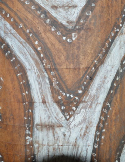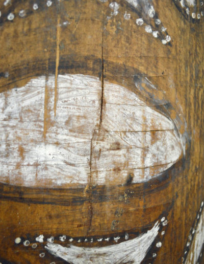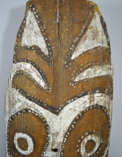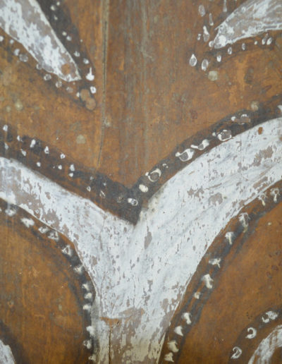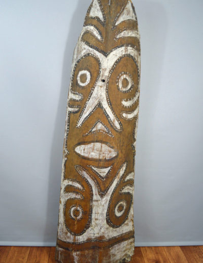 These wonderfully painted bark like panels are made by the Kwoma tribe of Papua New Guinea. Produces from sago petioles, the lower portion of the leaves of the sago palm tree. After the petiole is cured and flattened, the artist covers the smooth side with a wash of black clay. The main outlines of the design are laid out in clear water, retraced in the paint, and then filled in with colour and other pigments. The semi naturalistic designs represent people, animals, or other natural phenomena associated with the village clans. Each artist primarily creates paintings of designs that are associated with his own clan. Then these painted panels are installed on the ceiling together with those of other clans. Artists from several different clans were involved in the production of the present ceiling. Panels would be painted with clay and vegetable-based paints made from the village. Bark panels were used quite often to decorate the inside of Men’s meeting houses. These decorations vary from one village to another and they are supposed to protect ancestors and ward off unwanted spirits. They are extremely light and delicate/fragile pieces of artwork.